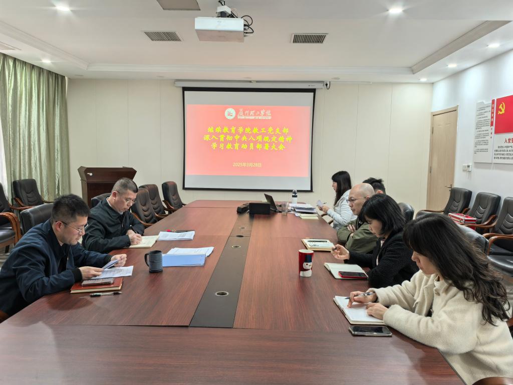 3月28日下午,继续教育学院教工党支部在思明校区综合楼403会议室召开全体党员大会,深入学习贯彻习近平总书记关于学习教育的重要讲话和重要指示精神,传达学习中央、省委和校党委党的建设工作领导小组会议精神,传达学习中共中央、省委和校党委关于在全党开展深入贯彻中央八项规定精神学习教育工作部署,并就学院深入贯彻中央八项规定精神学习教育相关工作进行动员部署。学院教工党支部书记王昊主持会议,学院党总支书记兼院长洪开河作动员讲话,教工党支部全体党员参加了会议。